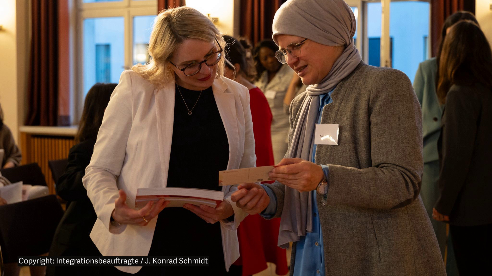 Zum Abschluss des Gesprächs überreichte die Vorstandsvorsitzende Ayten Kılıçarslan der Beauftragten zudem das Buch 41-mal Maschallah. Die Porträtsammlung „41-mal Maschallah“ erzählt die Geschichten von 40 starken Frauen, die unter anderem durch die Arbeitskraftanwerbung nach Deutschland kamen.