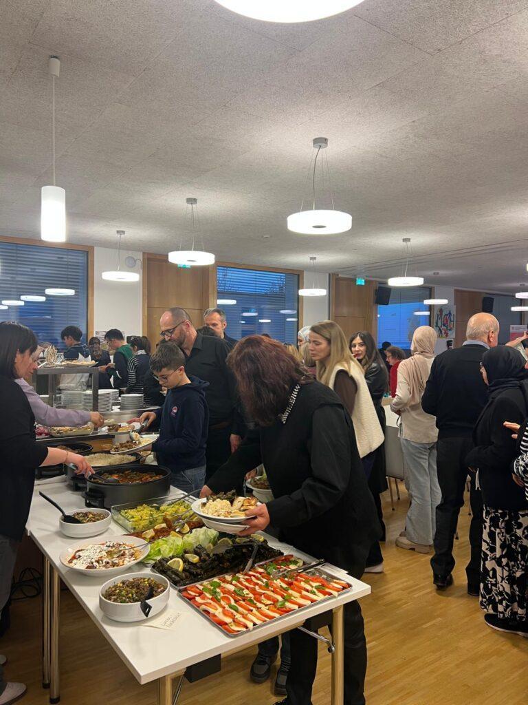 Im Anschluss wurde gemeinsam das Fasten gebrochen. Bei einem vielfältigen Buffet mit traditionellen Gerichten konnten die Gäste nicht nur die kulinarische, sondern auch die kulturelle Vielfalt genießen. Desweiteren gab es ein spannendes Quiz, wodurch sich die Gäste in ihrem Wissen über die besondere Zeit des Ramadans testen konnten. In einer offenen und herzlichen Atmosphäre entstanden Gespräche über Religionen, Traditionen und persönliche Erfahrungen, die den interkulturellen Austausch bereicherten.